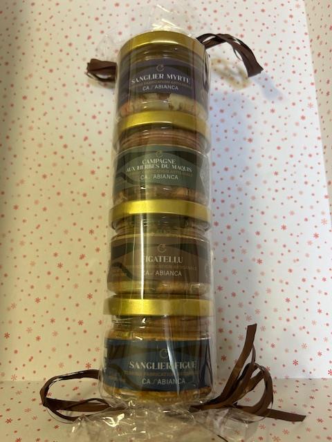 COMPOSITION : 4 terrines de 50 GR : SANGLIER MYRTE / CAMPAGNE AUX HERBES DU MAQUIS / FIGATELLU / SANGLIER FIGUE